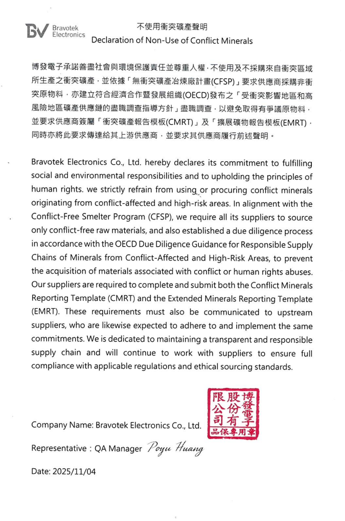 Bravotek Electronics Co., Ltd. hereby declares its commitment to fulfilling social and environmental responsibilities and to upholding the principles of human rights.